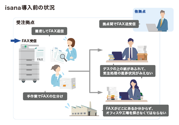 isana(イサナ)なら本社と支社、工場など離れた拠点間でFAXを共有することが可能。情報共有や集約を効率化できます。