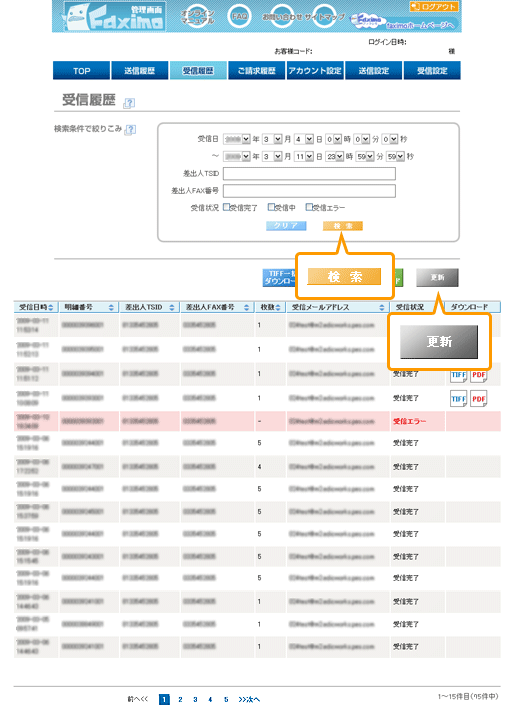FAXイメージはTIFF形式とPDF形式のファイルをダウンロードできます。